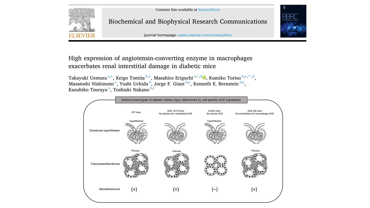 上村貴之先生の原著論文が2026年1月17日にBiochemical and Biophysical Research Communications誌に掲載されました!九州大学腎臓内科との共同研究で、当教室創設以来、初めての基礎研究論文の報告となりました。本研究では、糖尿病性腎臓病におけるマクロファージ由来ACEの役割を検討しました。腎常在マクロファージに発現するACEが、糸球体過剰濾過や尿細管ACEとは独立してアルブミン尿および間質線維化に関与することを示し、新たな治療標的となる可能性を示唆しました。