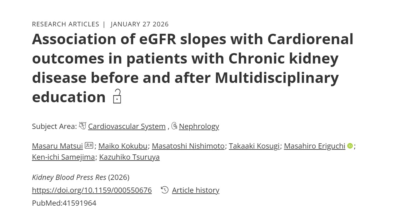 松井勝先生の原著論文が2026年1月27日にKidney and Blood Pressure Reserch誌に掲載されました。慢性腎臓病(CKD)患者を対象に、多職種による教育介入の効果を検討しました。教育後に腎機能低下が改善した患者では腎・心血管イベントが少ない一方、教育後も腎機能低下が速い患者ではリスクが高いことが分かりました。多職種教育の効果が十分でない患者への早期対応の重要性が示唆されました。