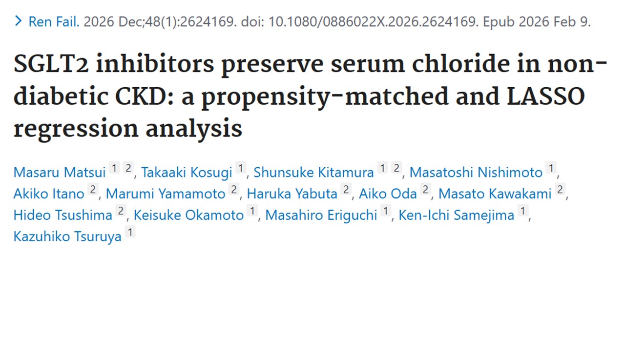 松井勝先生の原著論文が2026年2月9日にRenal Failure誌に掲載されました。非糖尿病・非蛋白尿CKD 343例の後ろ向き観察研究で、血清Clの年間変化は非使用群 -0.39mEq/L/年に対しSGLT2阻害薬使用群では 0.49 mEq/L/年で、**群間差 0.88 mEq/L/年(p<0.001)と有意にCl保持が示されました。PSマッチング後も群間差 0.44 mEq/L/年(p=0.036)**と有意差が持続しており、SGLT2阻害薬が血清Cl保持に最も強く関連し、新たな尿細管電解質作用として心腎保護への関与が示唆されました。